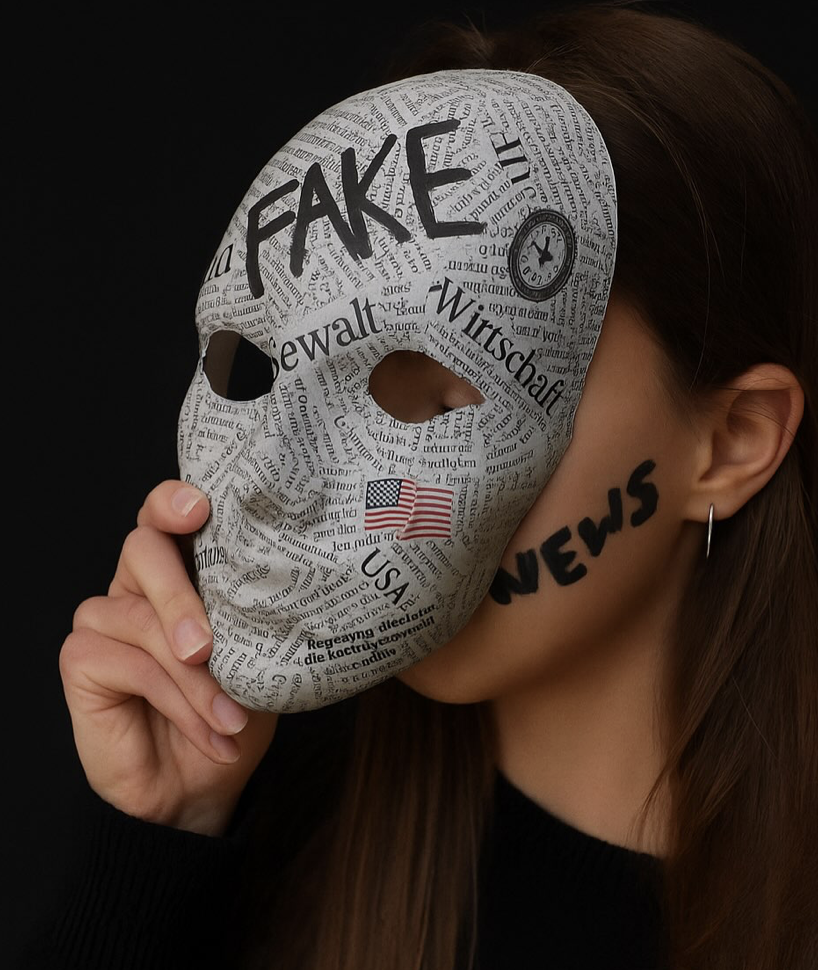 In ihrem Beitrag setzen sie sich kreativ und kritisch mit dem Thema Fake News auseinander und stellen gleichzeitig die Frage, wie „echt“ wir selbst eigentlich sind. Die Maske mit Zeitungstexten symbolisiert die tägliche Informationsflut. Die Aufteilung in „FAKE“ auf der Maske und „NEWS“ auf dem Gesicht dahinter zeigt, wie leicht man sich vom ersten Eindruck täuschen lassen kann – und dass Wahrheit oft erst sichtbar wird, wenn man genauer hinschaut.